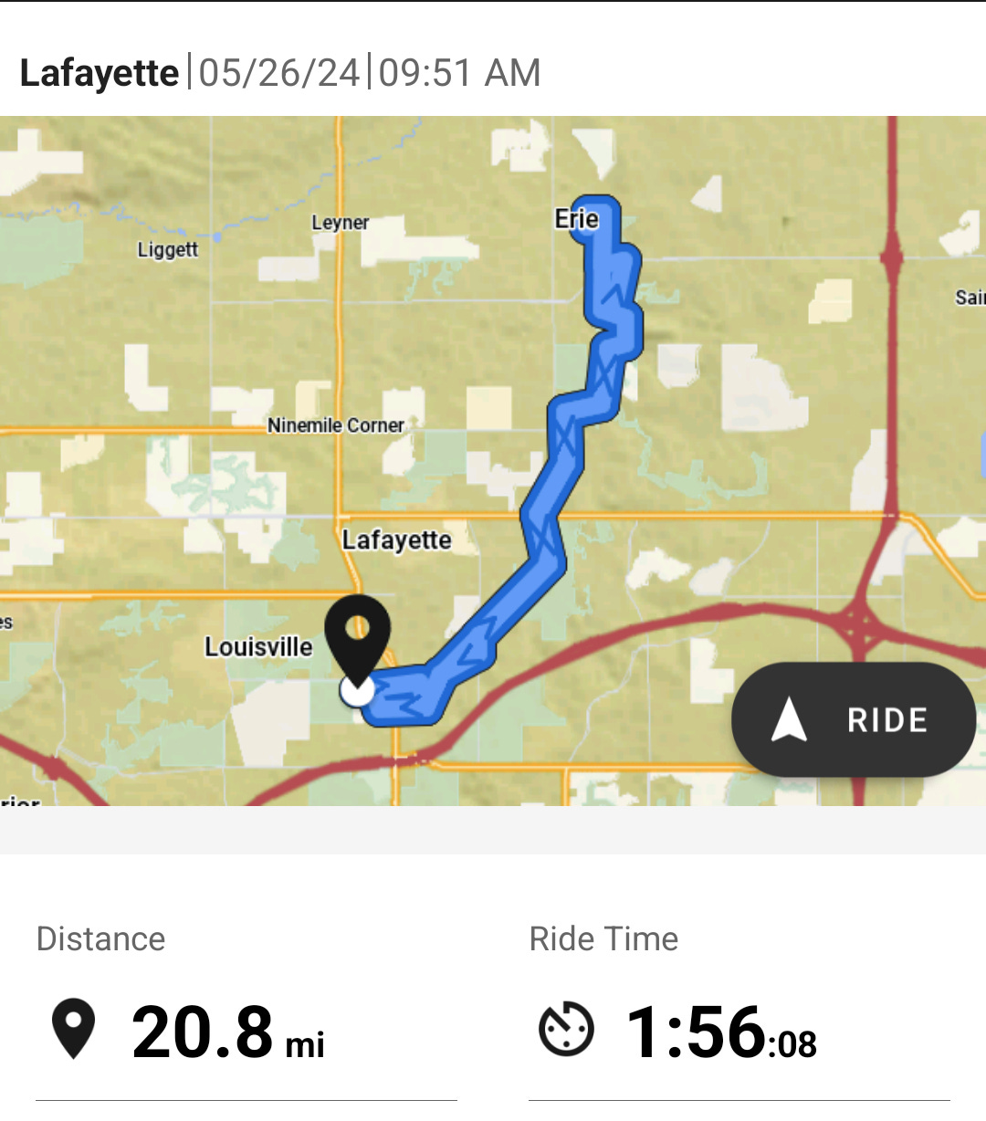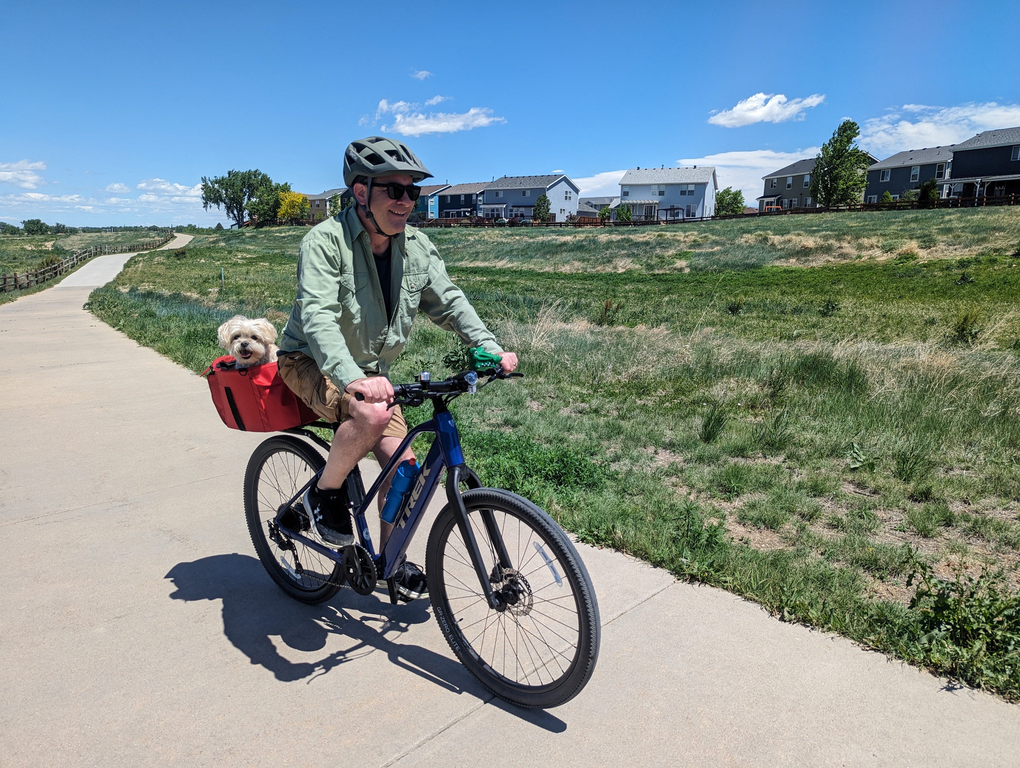 So that was a Saturday. On SUNDAY, we ventured out again. But this time in the opposite direction with the goal being to make it to the town of Erie to the northeast. We thought it might be nice to have lunch downtown. We also wanted to try the doggy basket on the new bike. And it worked! Penny is back in action!