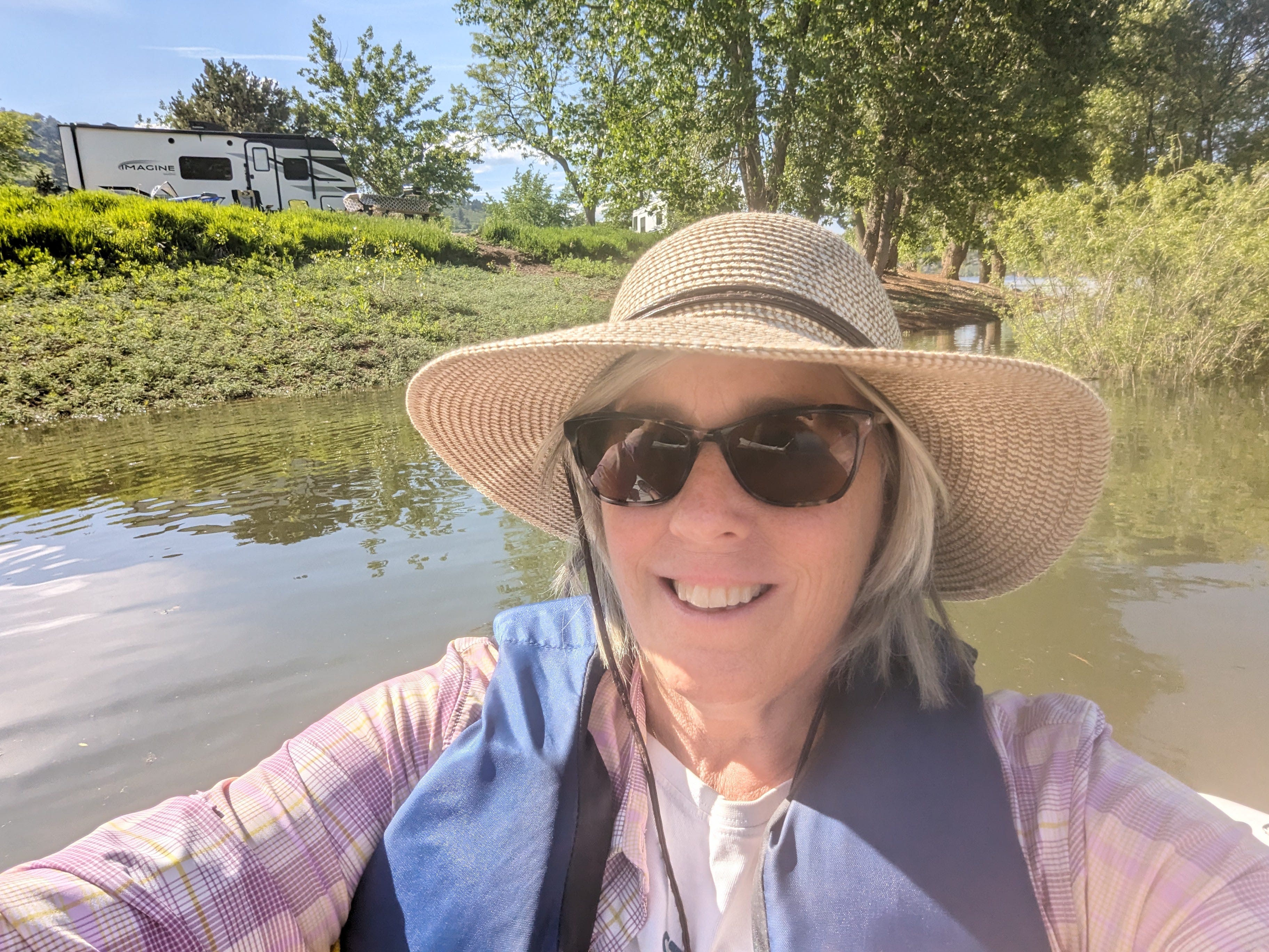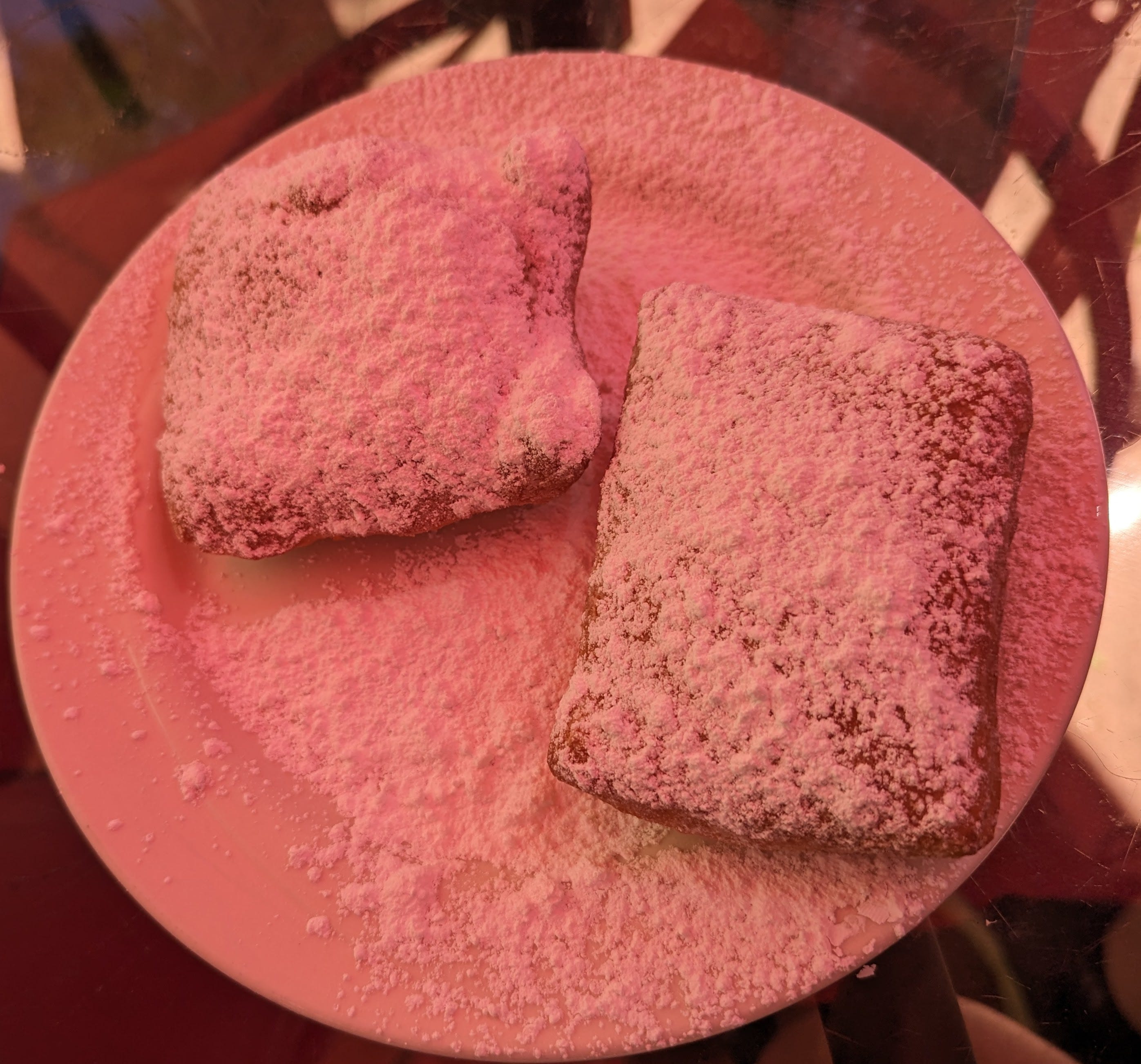 Because we were on bikes and only had the dog basket, we couldn’t take any leftovers home. Therefore, we ate as much as we cared to and rode home rather sated. And this is where some motor power proved handy. We had ridden under our own power all the way out, so we gave ourselves a little break going home. It turned out to be quite a bit more uphill going home also. Next time we will skip the beignets!