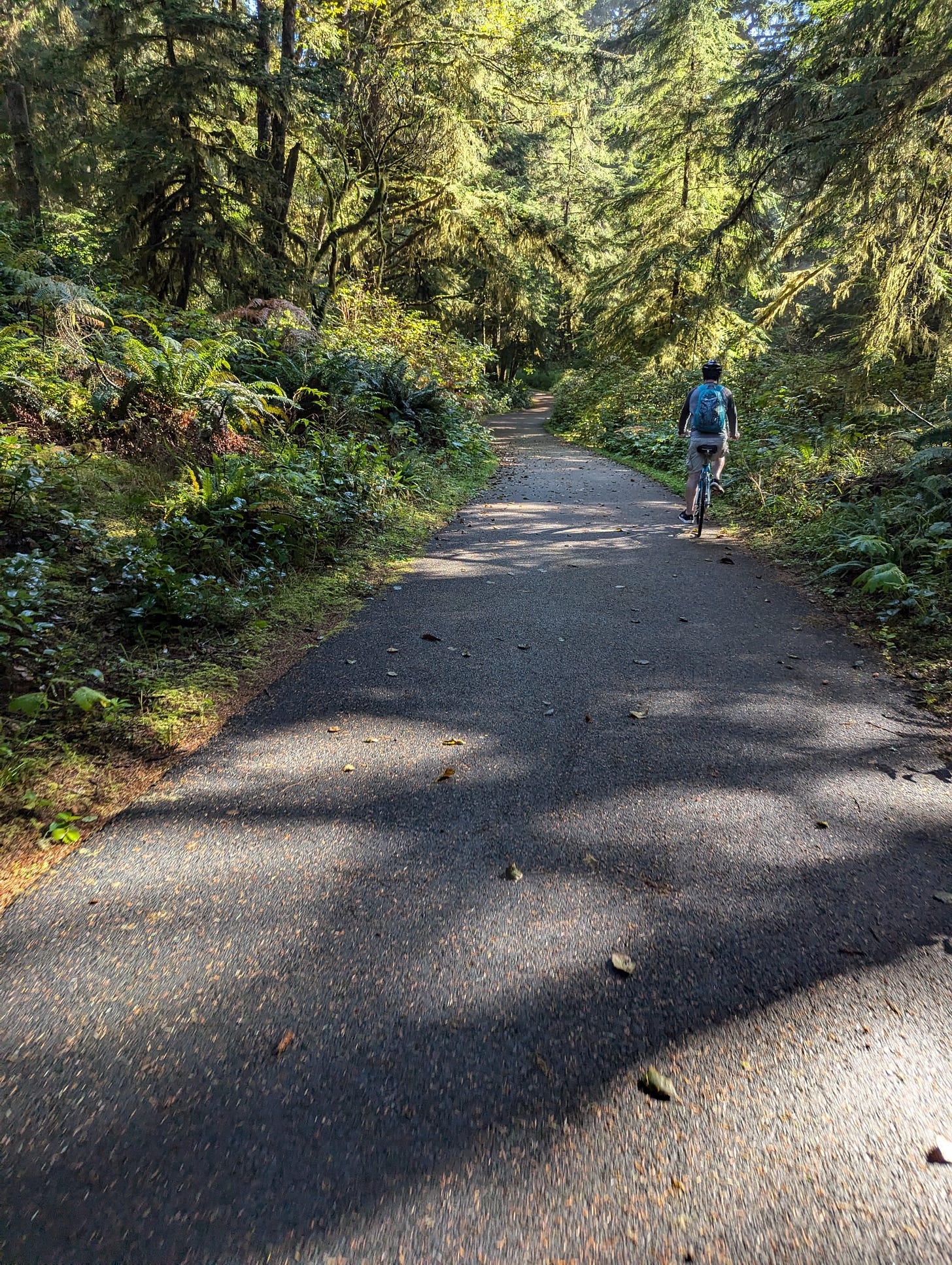 The trail was nearly empty of other cyclists (or pedestrians) and and after a few miles it eventually enters a forested area as you approach Cape Disappointment State Park. It becomes surprisingly hilly as you near the lighthouse. At one point, it has a 9% grade, but it doesn’t last long. In this densely forested environment, you could even forget that you’re near the beach.
