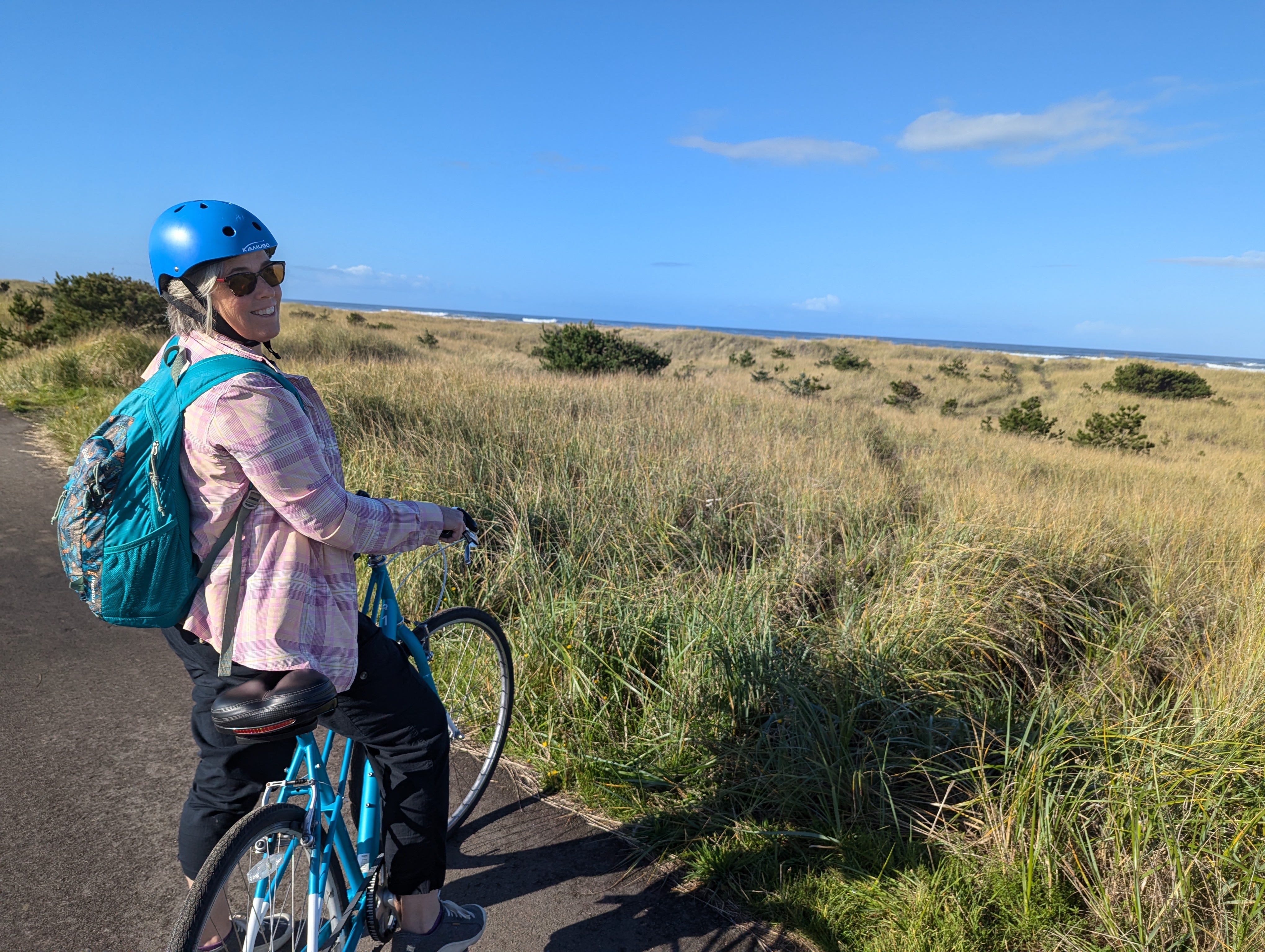 We hadn’t rented bikes ahead of time, so the next morning we walked over to a rental shop near the hotel only to find out that they were closed until the weekend. A slight panic overcame me since our plan for the day was to explore the Discovery Trail. Maybe shoulder season was giving us the COLD shoulder. Fortunately, the next place we tried, Tsunami Cycle, had just what we needed! We rented two non-electric 9-speed bikes. Even though they had rubber belts instead of normal chains, they rode very comfortably and smoothly. This place included water bottle holders and helmets at no extra change. Sweet! They were really friendly, helpful, and. just a top-notch shop.