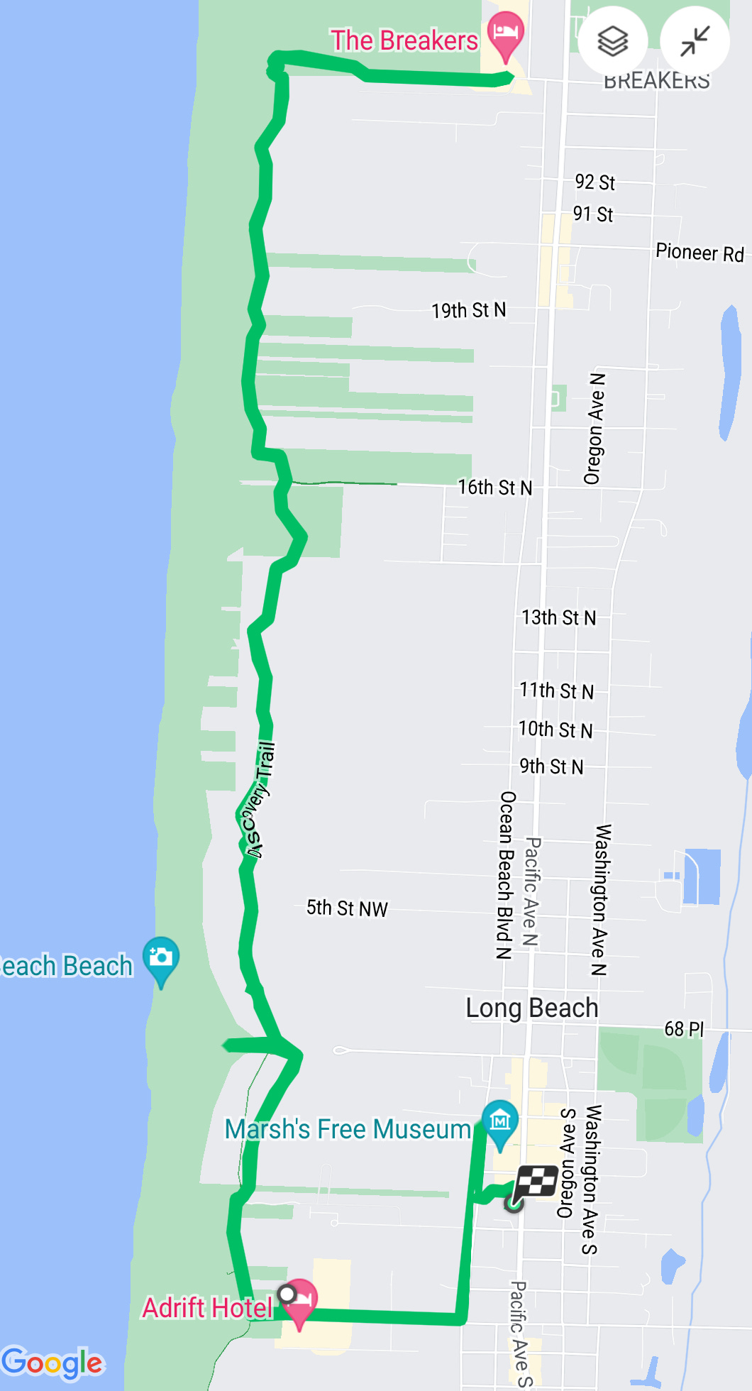 Since this is the southern terminus of the Discovery Trail, we turned around and headed back toward Long Beach. Part way back there is an option to cycle a little ways east to the town of Ilwaco. We chose not to do that and instead headed to lunch in Long Beach. After lunch we continued north on the path. The last stretch of the northern section is through several miles of dunes with little shade and some beach views. The southern end of the trail was definitely the most fun in terms of variety and scenery, but we did both ends because we wanted to see it all. By the time we returned our bikes, we had cycled 18 miles and seen the entire trail from end to end.
