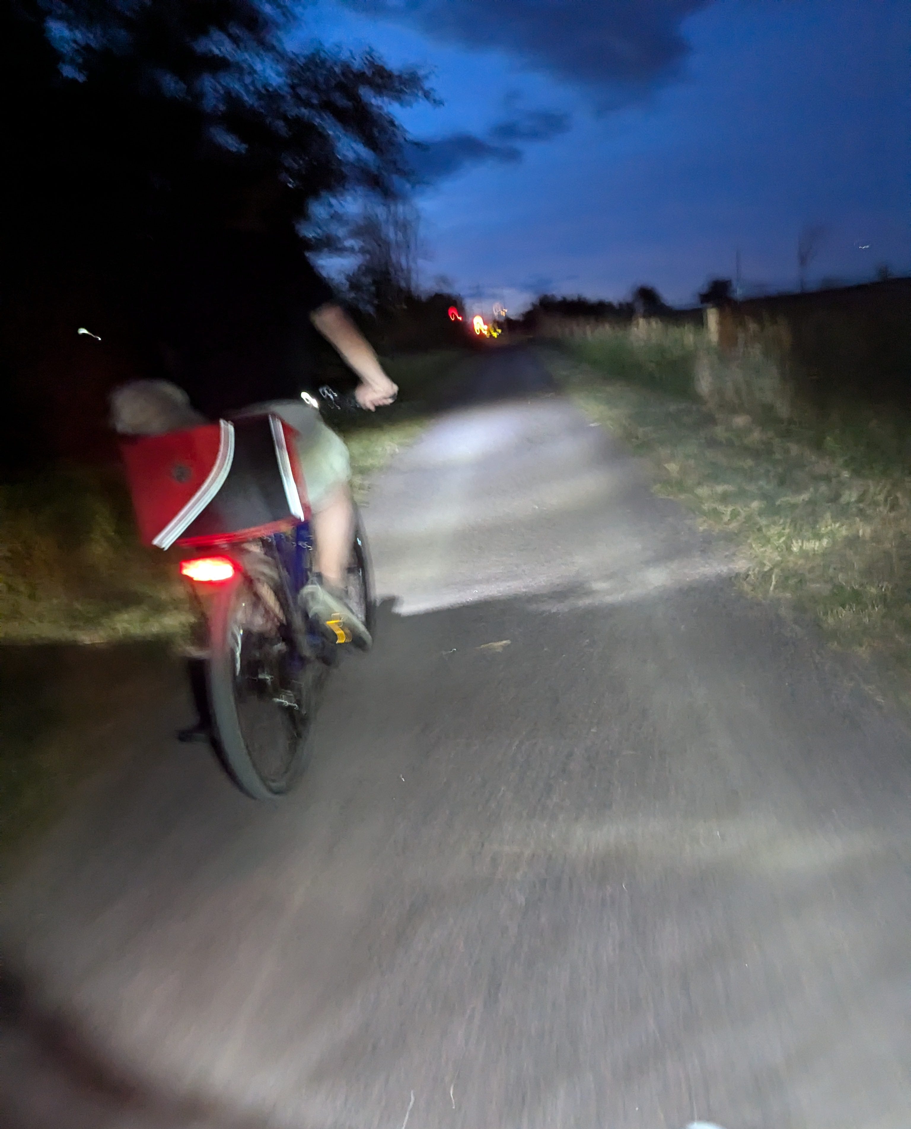 After one round of Kingdomino and a tasty chicken salad, we loaded Penny back up into her basket. By now, dusk had fallen and we got to ride home in near-dark using our headlights and taillights. I also got to finally try out the add-on light I purchased for my Thousand helmet. We discovered that sucker is BRIGHT!!! Very much worth the $25. It has a solid mode and a flashing mode and it’s also magnetic, so you can pop it on or off at will. It has USB charging and can last up to 12 hours. Very handy!
