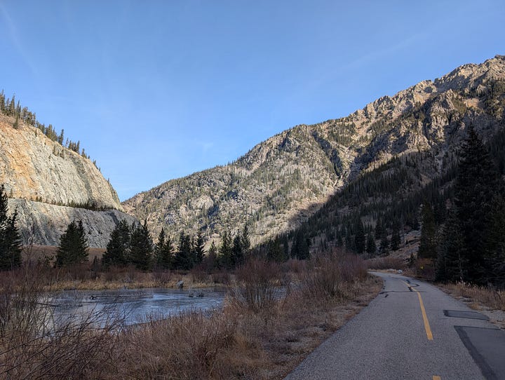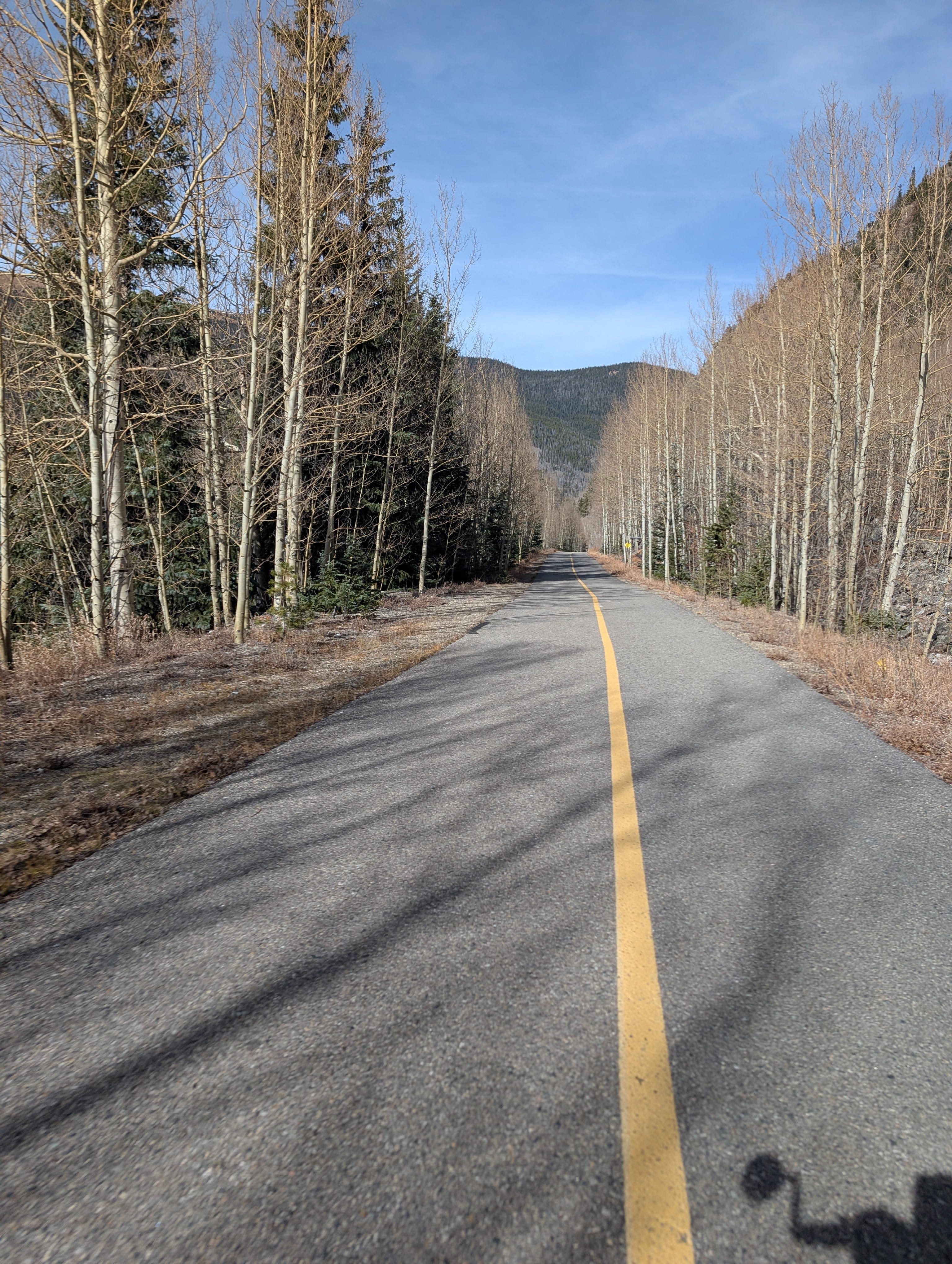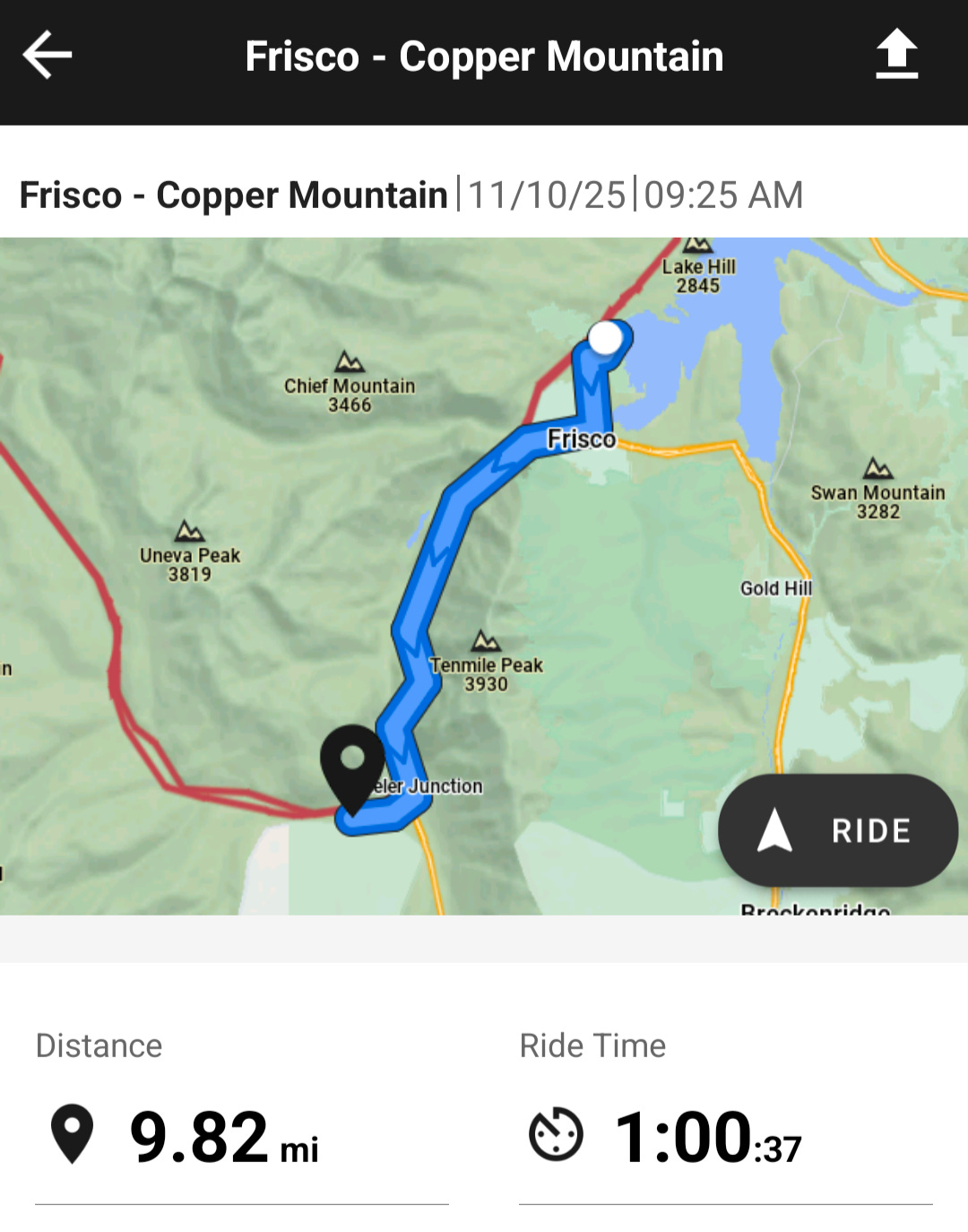 Well… on this long weekend trip to Frisco, Greg suggested riding to Copper Mountain. It took a few minutes until it sunk in that this was essentially the same trip I had planned for that fateful summer. Only now it was late into autumn and it was happening spur of the moment. The only change was that we would ride up to Copper Mountain about 10 miles away instead of to the top of Vail Pass 15 miles away. That sounded perfect to me since I’d noticed my heart rate remaining pretty high since we’d arrived. No need to push it!