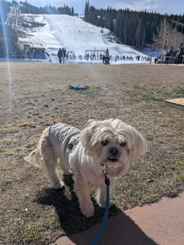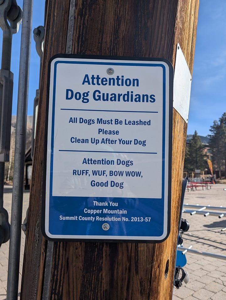 We sat in the comfy Adirondack chairs and enjoyed a snack while we watched skiers and snowboarders make their first turns of the season on manmade snow. What a crazy juxtaposition to have just wheeled up on our bikes, now feeling warm from the exercise and sunlight. Penny behaved herself and appreciated that the sign was inclusive enough to speak her language.