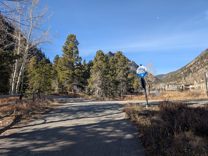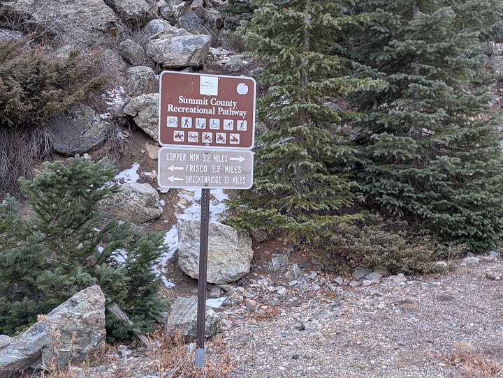 We set out the same way as we rode into town the day before. We took the Dillon Reservoir Recpath to downtown. Then, we went all the way west to the end of Main Street and got on the Tenmile Creekpath at the trailhead off of Forest Drive. It was very easy to find. From here, it’s only about 6.5 miles to Copper Mountain.