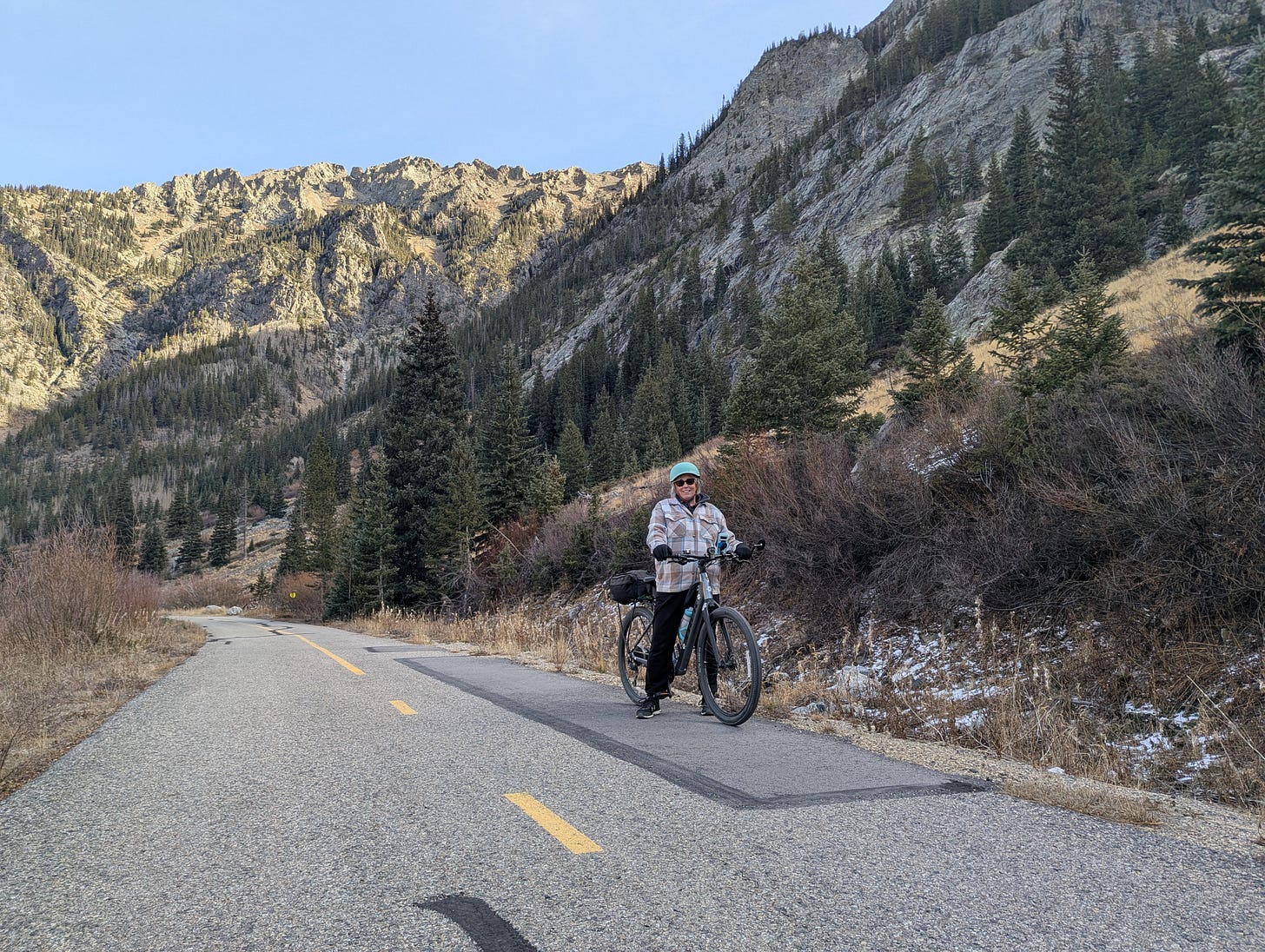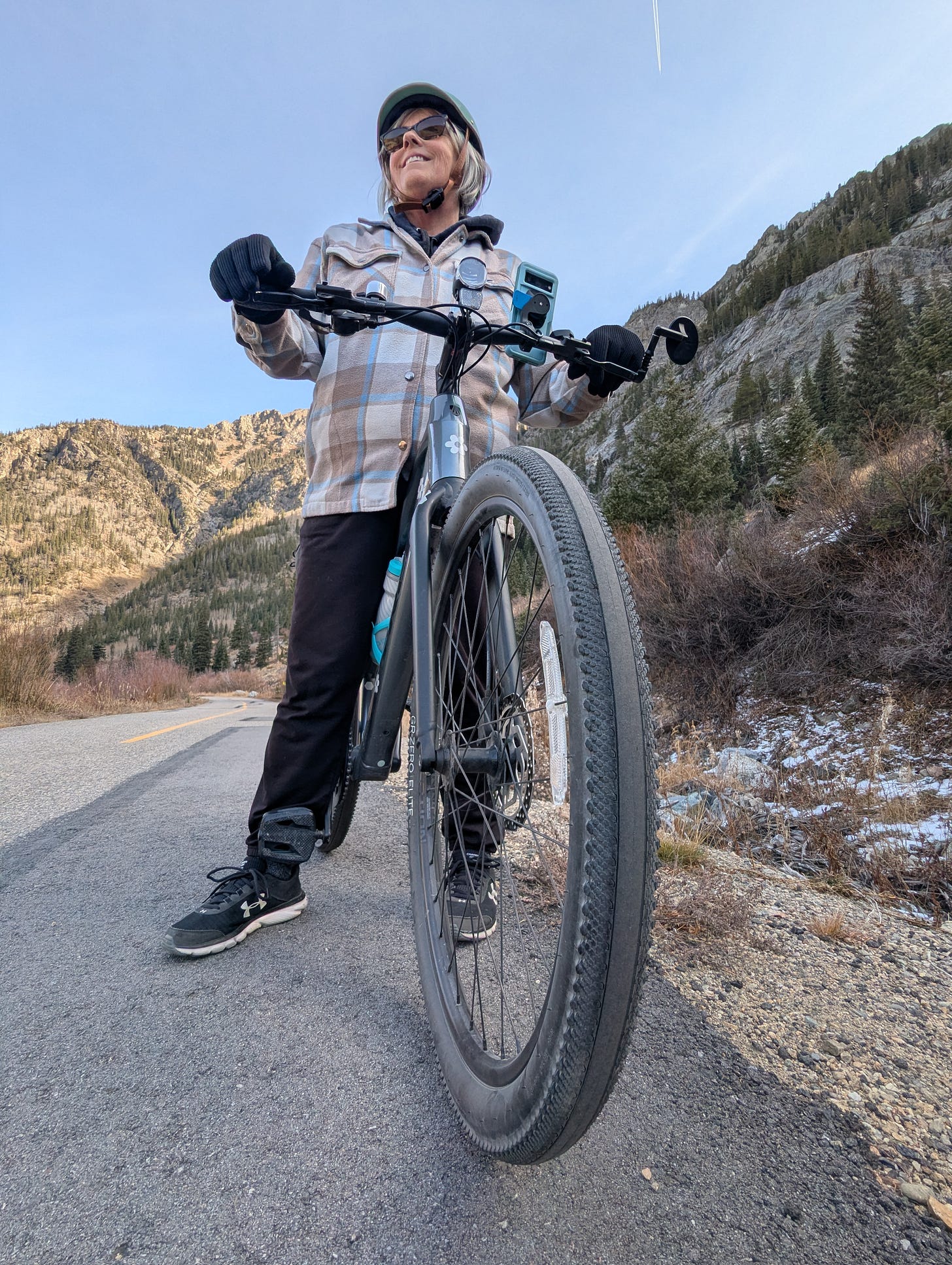 As we headed southwest, we had a small stretch of sunlit path, but it was quickly swallowed up by the shade of the north facing mountains. I realized then that time of day could make a big difference on this ride. It was chilly, for sure, so I wanted to come around a bend and find some sunshine. Which we eventually did. There was only one TINY patch of snow on the trail (like 30 feet) and it was easily navigable. It was more like a dusting. As we rode, our body temperatures rose and we stayed comfortable and enjoyed the breathtaking views.