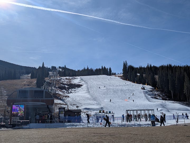 Once we arrived at Copper Mountain, we were able to ride our bikes right up to the base and watch skiers come down the ONE open run. Our family has spent many, many years skiing at Copper and it was definitely a different feeling to ride up to the chairlift on a bike.