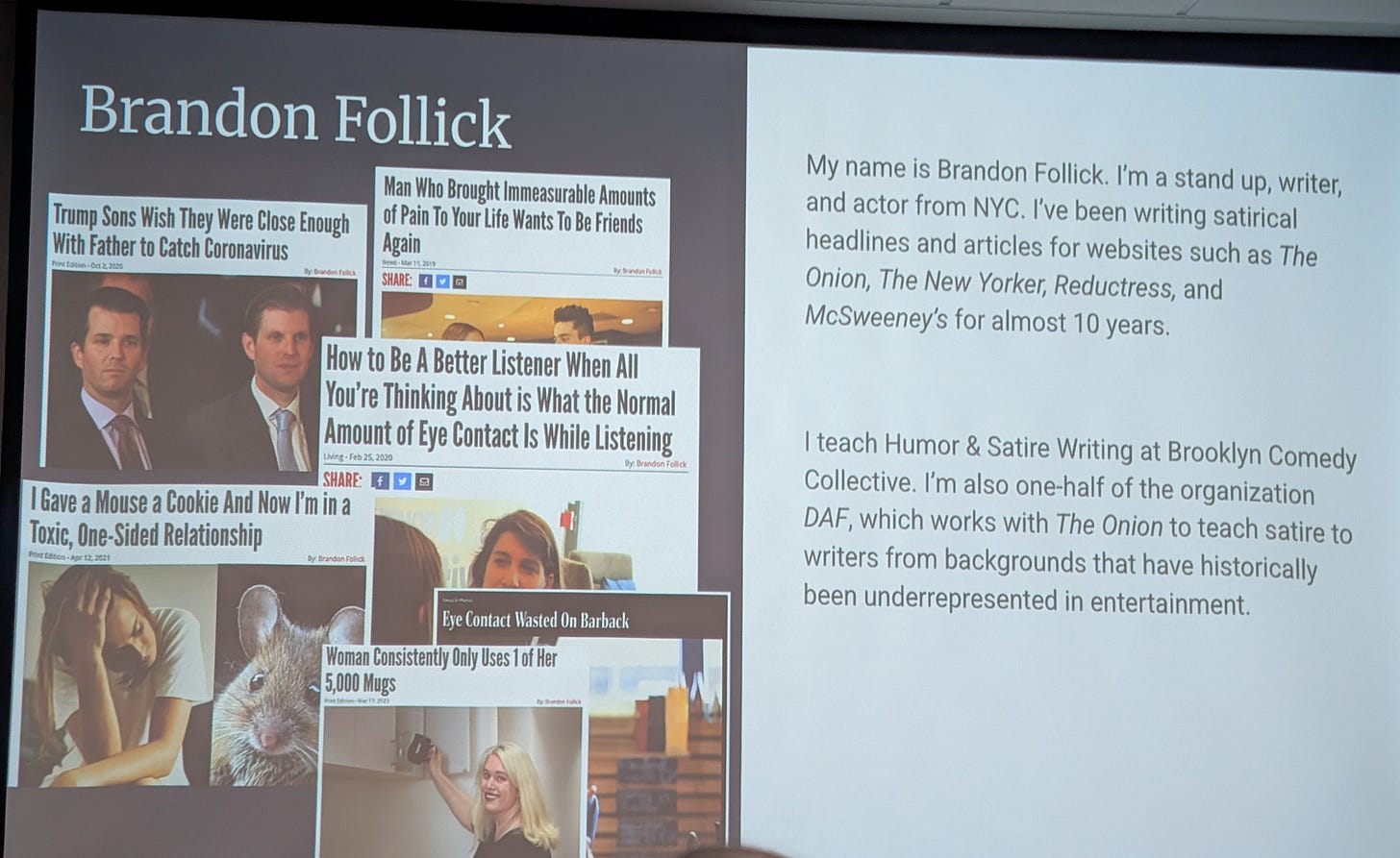 It’s too soon to tell if my writing will be better (or funnier) based on the wisdom that was imparted in my direction, but I came away with some renewed excitement about the possibilities. I met some truly remarkable people and just seeing other attendees who were making this work for themselves out of sheer determination and creativity was motivating and encouraging. One of my main intentions was to figure out where to publish future pieces. My ears perked up at every suggestion and I came away able to make a nice Google Doc of recommendations. It’s linked here in case any of my new workshop friends are reading. Or any dear readers have a hankering for humor writing!
